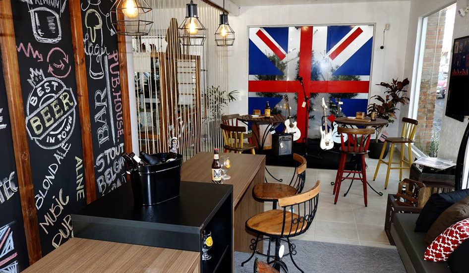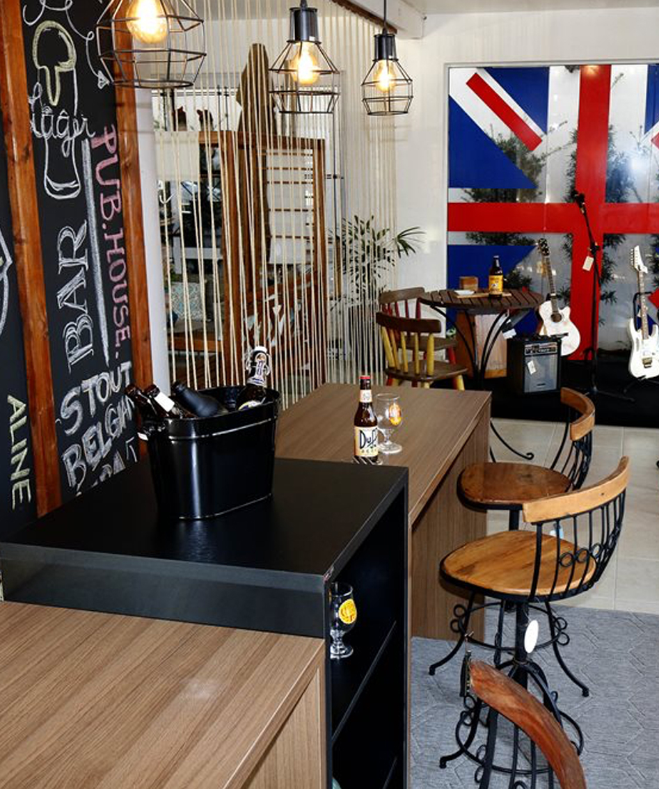 O estilo característico do bar inglês é trazido para dentro da residência com a reprodução desta vitrine do arquiteto. Pub é uma abreviação do inglês public house, cujo significado é casa pública onde são servidas bebidas e comida ligeira e este ambiente rústico, de personalidade forte e iluminação baixa tornam o espaço acolhedor e um ponto de encontro para amigos que gostam de música ao vivo e de se reunir para confraternizar.