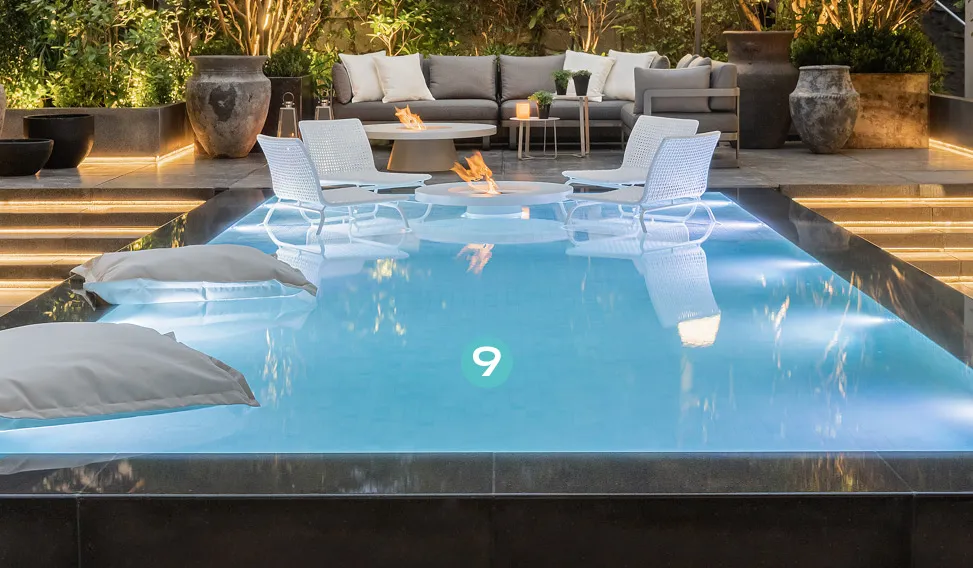 Piscina retangular em linhas retas, contempla uma praia que possui o sistema de transborde em três partes frontais com efeito de borda oculta na área da praia.